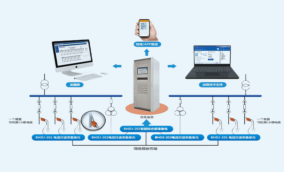 可同时监测24条电缆线路,线路可以跨母线进行监测,若监测线路条数多于24条,需要根据数量增加电流行波采集单元。